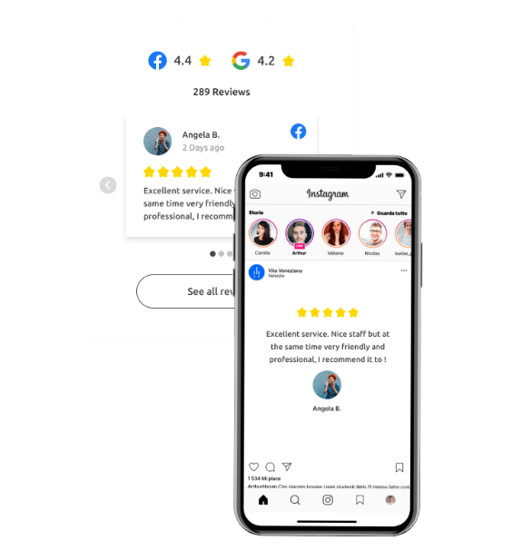 Teile die besten Bewertungen auf deiner Facebook- oder Instagram-Seite über anpassbare Vorlagen.